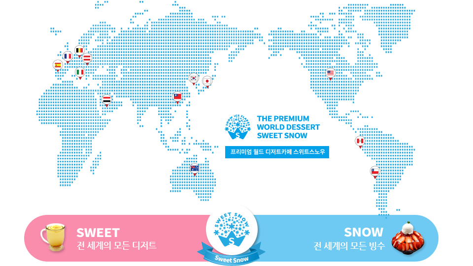 Sweet Snow 는 3년여의 긴 준비 기간을 통해 각 국의 문화 & 디저트를 전문적으로 연구, 개발하여 전 세계적 트랜드를 통해 빠르게 변화하는 국내 소비자의 니즈를 파악 하였으며 5성급 호텔에 디저트를 공급하는 20년 경력의 파티쉐 CNB그룹과 손을 잡고 세계 각지의 디저트들을 국내 흐름에 따라 개발 및 판매 합니다.